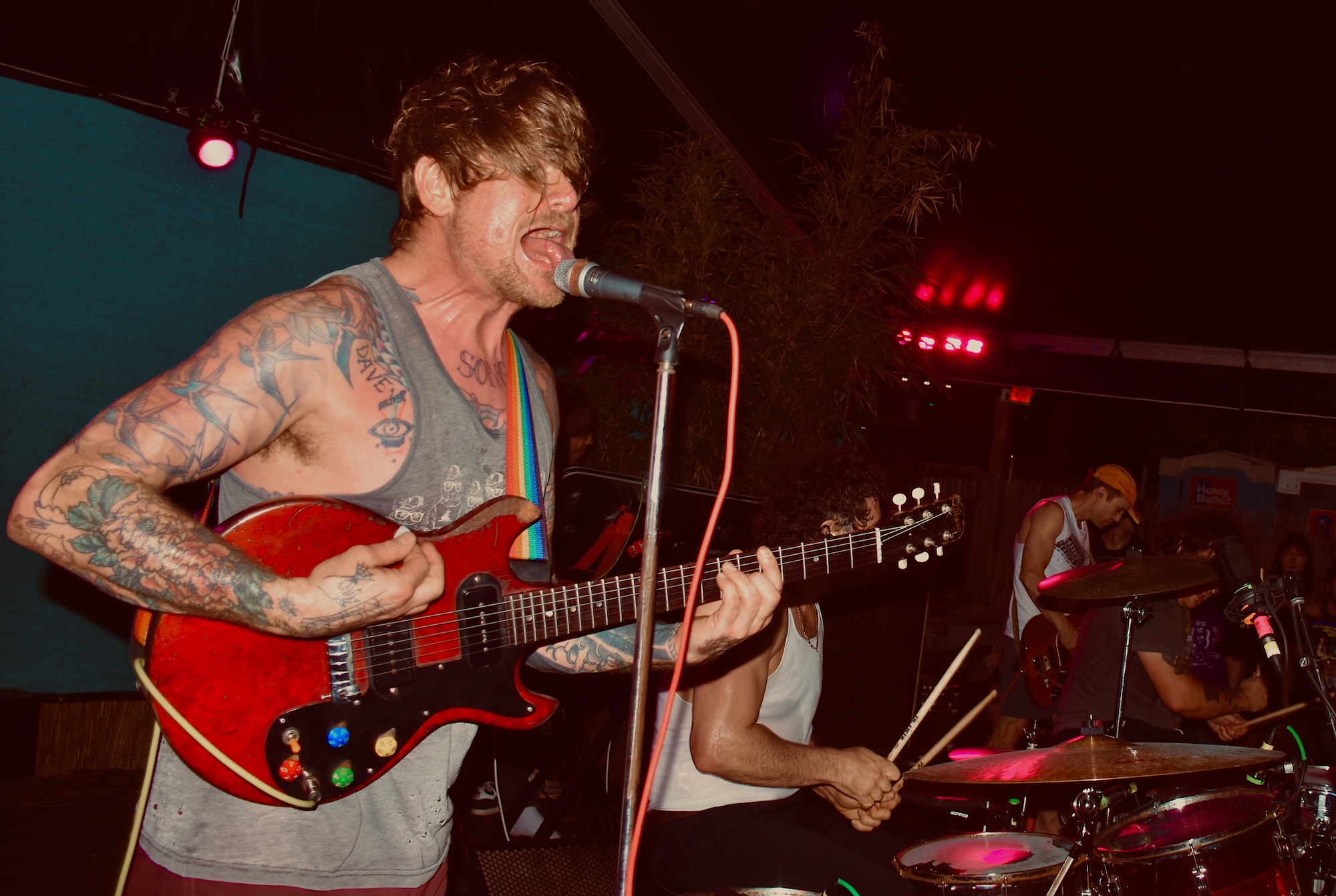 Night two saw more setlist variation from Dwyer’s arsenal of bangers, but not without a jackhammer of an opening with A Weird Exits live favorite “Plastic Plant” with all of the gargantuan fuzz and shredding from guitar god Dwyer. The fans at Hotel Vegas for these shows are known to bring it for Osees’ coveted Austin stops with stage diving, crowd surfing, and moshing antics of all kinds. Hotel Vegas provides the rowdiest of rowdy backyard vibes, rejoicing in the tradition of Dwyer’s regular Austin appointments that can only be curbed by global pandemics. Even then, the quarantine live LPs prove that not even impending worldwide doom can stop them.